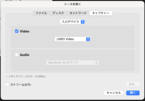 – Videoにチェック、デバイスを選択(この時の名前がデバイス名)、開く