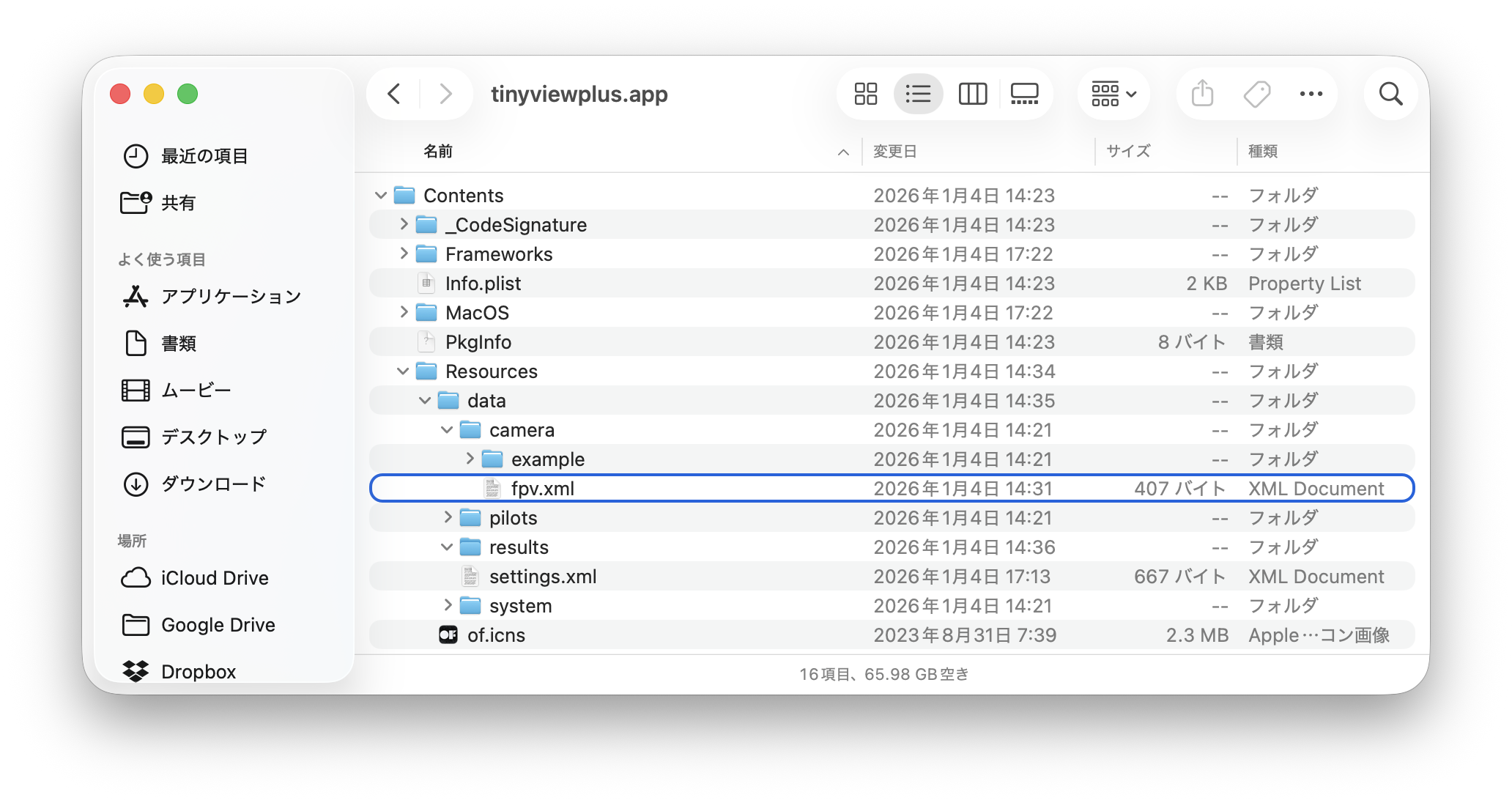 fpv.xmlなどの設定ファイル、レース結果を保管するresultsフォルダーはMacOS版においてはアプリケーションパッケージに内包されています。