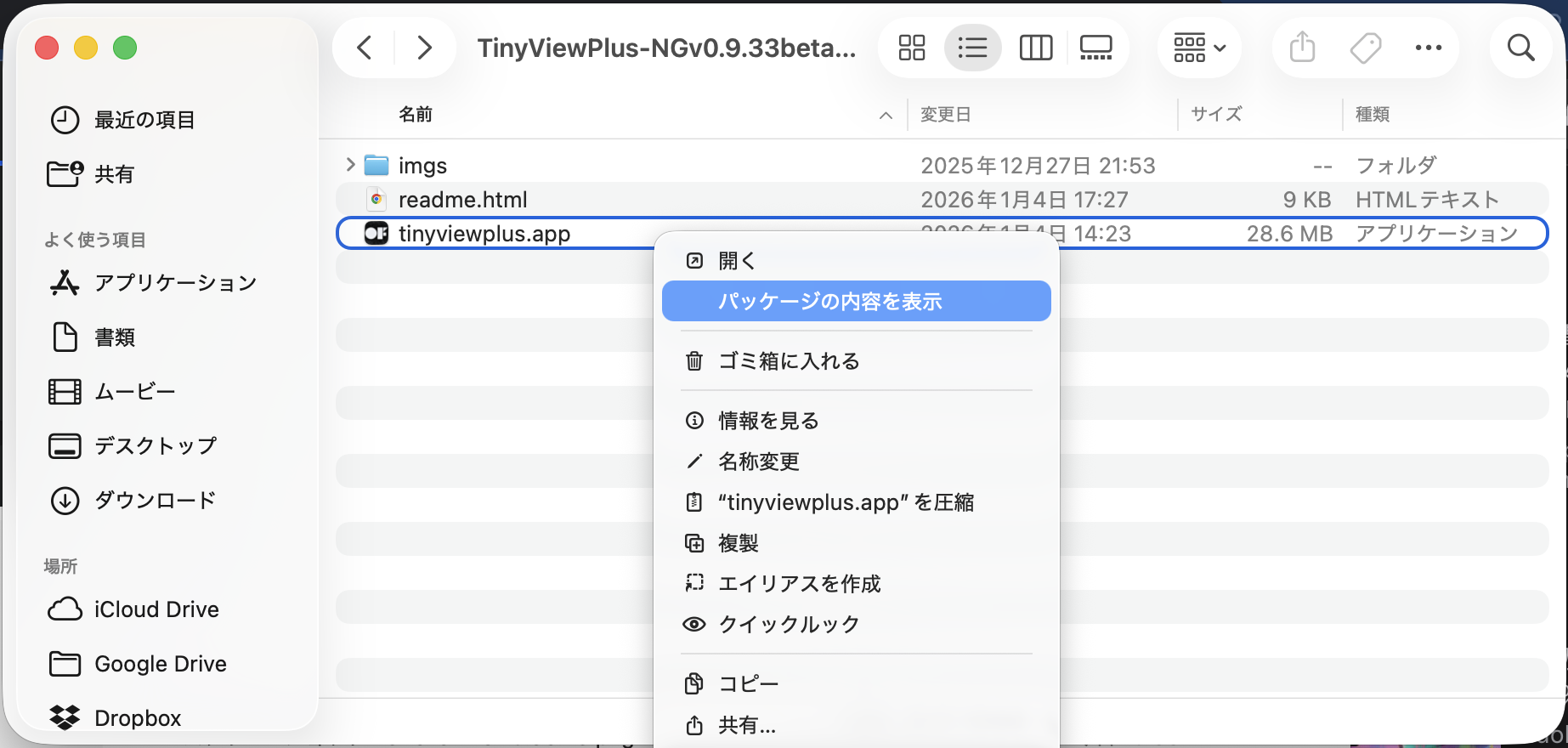 アプリケーションファイルで右クリックメニューで「パッケージの内容を表示」をクリックします。