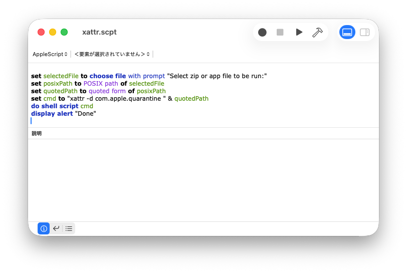 xattr.scptをダウンロードしてダブルクリックするあるいは下の内容をスクリプトエディタに貼り付けます。