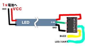 絵にするとこんな感じになっています。全周巻ではない場合はATtiny85チップとLEDに並行した電源線の接続でも構いません。スイッチの配線は一般的にはBUZZもしくはLED/UARTのどちらか一方を使用します。